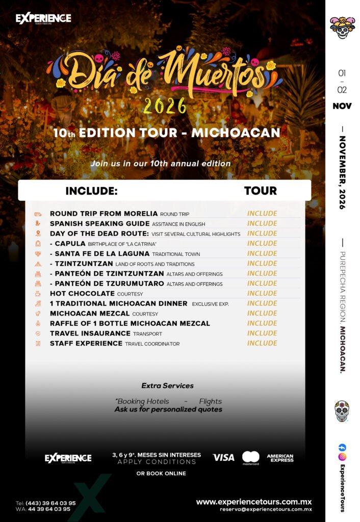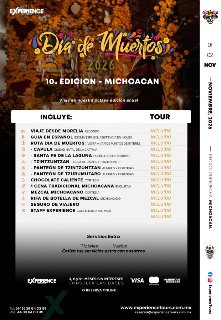 El itinerario contempla paradas en Capula, famosa por ser la cuna de “La Catrina”, Santa Fe de la Laguna, un pueblo lleno de costumbres y arquitectura purépecha, y Tzintzuntzan, donde se realiza una de las conmemoraciones más impactantes con altares y ofrendas en su panteón. También se visita el cementerio de Tzurumútaro, reconocido por su atmósfera íntima y conmovedora.